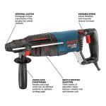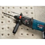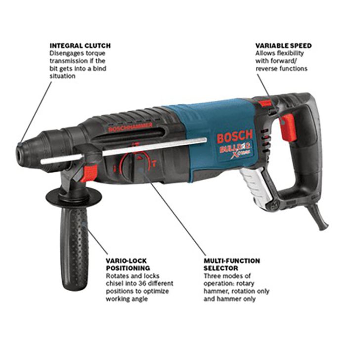 The Bosch GBH2-28L SDS-plus Bulldog Xtreme Max 1-1/8 In. Rotary Hammer features a powerful 8.5 Amp motor and KickBack Control. This feature is an integrated sensor to stop tool rotation during bit bind-up situations. A tool that upholds the tradition in the line of legendary Bosch Bulldog hammers, the GBH2-28L combines user comfort with versatile drilling and hammering functions. It provides counter-balanced Vibration Control for more comfortable handling of the hammer. Ideal for masonry pros or general contractors, this tool weighs only 6.9 Lbs. but delivers 2.4 Ft.-Lbs. of impact energy and 0-5,100 BPM. It has a multifunction mode selector for drilling versatility – drilling only, hammer drilling and chiseling. This Bulldog has ideal features for hard-working pros, including a variable-speed reversing trigger for accurate bit starting, Vario-Lock positioning for the optimal chiseling angle, a HammerHook that allows the user to hang the tool on the job and an ergonomic D-handle for user comfort. The SDS-plus system provides for tool-free bit changes.